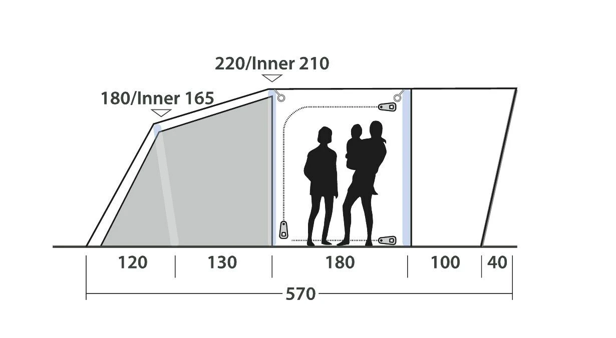Ambassador Dark Bedrooms – offer a deeper profile of bedroom, ideal for larger camp beds, queen sized airbeds, as it has enough depth for them to be positioned lengthways inside the inner tent. Further to this, the darker bedrooms have Quick and Quiet Access, which helps silent access into the sleeping compartment, to reduce the likelihood of waking someone. The doors do have ancillary zips to completely, and safely enclose the bedrooms entirely. The Springville will sleep up to 4 people across 1 bedrooms, which can be separated into two sleeping compartments, with the zipped inner divider.